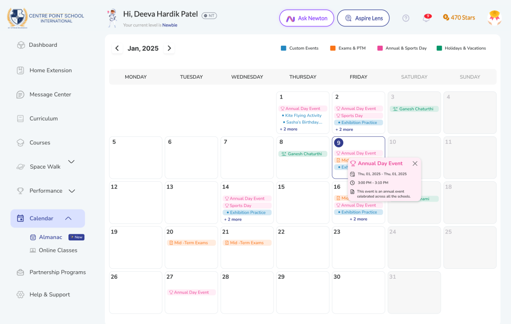 Almanac is the centralized academic calendar module within the K-12 LMS. It provides a structured and reliable source of information for all school-related events, including academic activities, examinations, holidays, vacations, and institutional events.