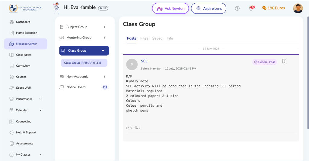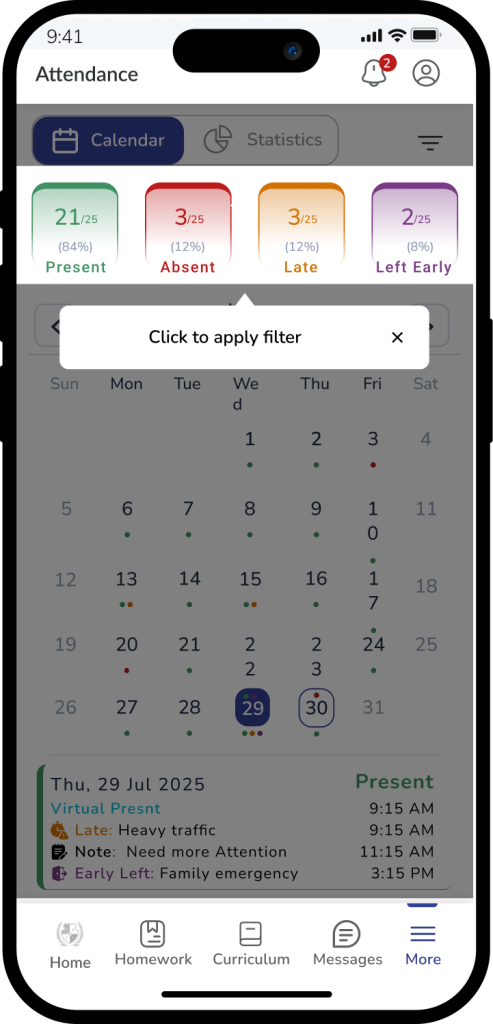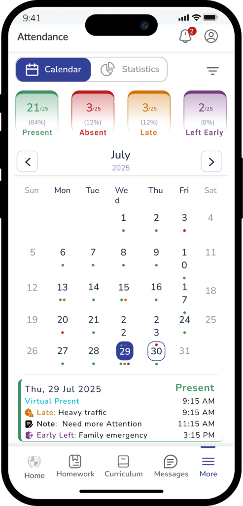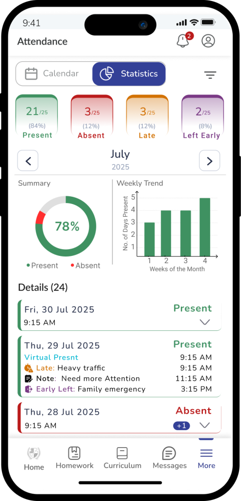 The Transfer Certificate feature allows parents to submit a formal request for a student’s exit from the school by providing a reason and feedback. Once submitted, the request is reviewed by the school administration.