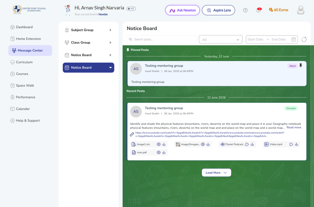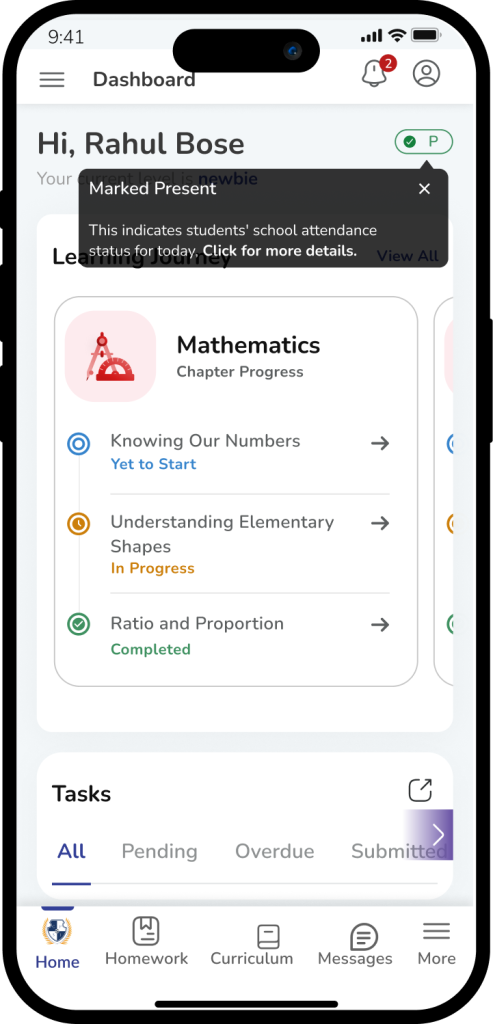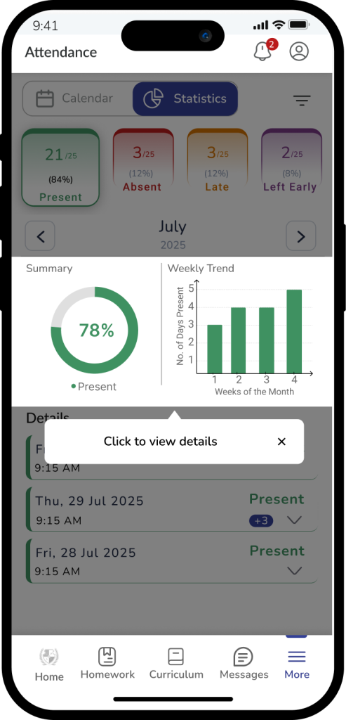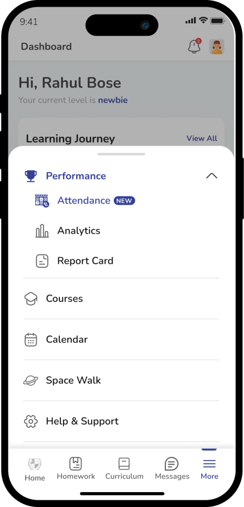 The Library module provides visibility into a student’s reading activity within the school’s physical library. It displays books issued to the student, their expected return dates, overdue indications, and return confirmations. The module helps parents and students stay informed about reading habits and ensures timely returns to support responsible academic behavior.