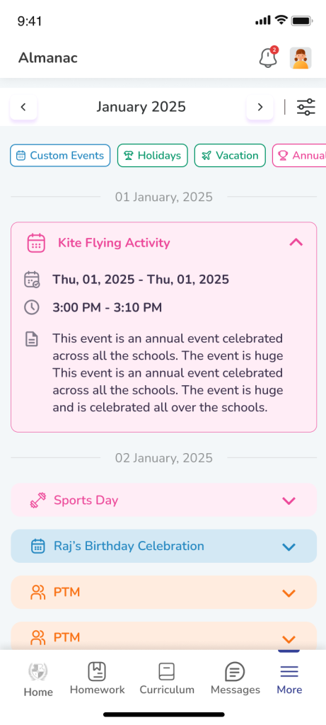 A single day may include multiple school activities such as exams, competitions, or meetings. The Almanac displays all events scheduled for that day so you can stay fully informed.