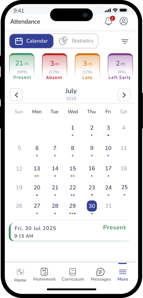 The Library module automatically receives book issuance and return updates from the school’s library management system (Skolaro). It displays this information in a structured, easy-to-understand format within the LMS on both web and mobile platforms. Parents and students receive notifications when a book is issued, returned, or overdue.