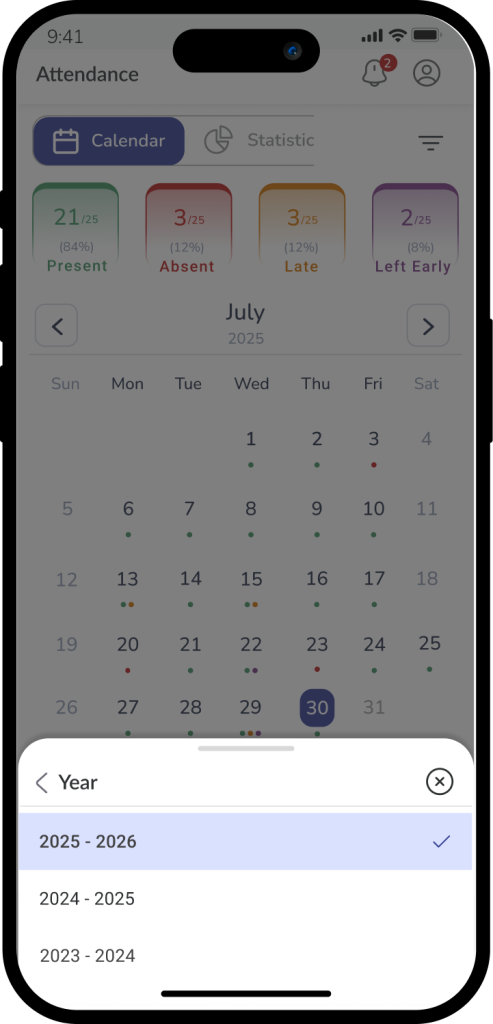 Use left and right arrows to switch months or tap the month name to change month or academic year